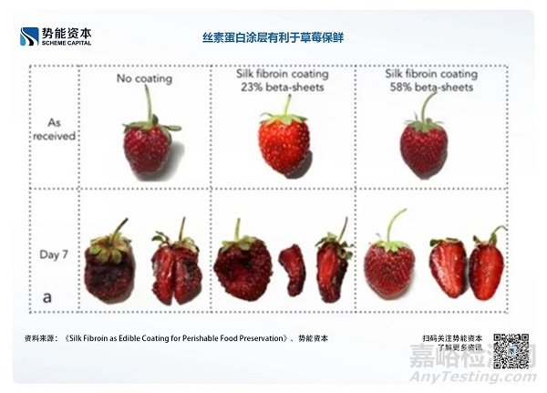 絲素蛋白也可用在保鮮膜等產(chǎn)品中, 將絲素蛋白再生為懸浮在水中的膠束或納米顆粒,可以形成特殊性能的材料作用于生物和非生物材料界面。Marelli等人將新鮮的草莓浸入1%絲素蛋白溶液中,重復(fù)操作四次。然后采用水冷退火工藝,在真空狀態(tài)下利用水蒸汽處理涂層的草莓,處理時(shí)間不同,所得涂層中的β折疊含量也不同。研究者將涂層草莓與未涂層草莓均置于室溫存貯。結(jié)果表明,涂層中β折疊含量越高,越有利于草莓保鮮,經(jīng)過(guò)涂層的草莓的果肉狀態(tài)明顯優(yōu)于未處理,絲素蛋白涂層可通過(guò)降低細(xì)胞呼吸速率和水分蒸發(fā)來(lái)延長(zhǎng)果實(shí)在室溫下的保質(zhì)期。
