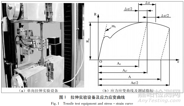 簡單的成形工藝控制指標一般采用單向拉伸實驗進行檢測,設(shè)備和應(yīng)力-應(yīng)變曲線如圖1所示,測試指標包括應(yīng)力-應(yīng)變曲線、屈服強度、抗拉強度、加工硬化指數(shù)n、各向異性系數(shù)r值等。其中,應(yīng)力-應(yīng)變曲線包含了所有單向成形性能信息,一般采用方程δ=K×εn進行描述;屈服強度指材料開始發(fā)生塑性變形的強度,其屈服形式包括非比例屈服、上屈服、下屈服等,屈服強度、屈服形式、屈服應(yīng)力值和屈服平臺量等可綜合用于評價和預(yù)測出現(xiàn)成形褶皺缺陷的情況。單向拉伸描述的材料成形屈服準則較為簡單,即材料單向應(yīng)力達到屈服點時由彈性狀態(tài)進入塑性狀態(tài)??估瓘姸仁遣牧侠鞌嗔褧r的強度,用于簡單評價材料成形破裂時達到的強度值。加工硬化指數(shù)n值表征材料塑性變形過程中強度增加的能力,n值越高,材料抵抗縮頸變形的能力越強,平均n值一般由拉伸設(shè)備直接測量得出,瞬時n值等可由拉伸曲線計算得出;各向異性系數(shù)r值指材料沖壓塑性應(yīng)變比,是寬度方向應(yīng)變值與厚度方向應(yīng)變值的比值,表征材料減薄變形能力,r值越高,材料越不易減薄開裂。