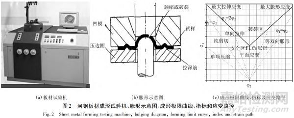 為了更準確地表征材料的沖壓成形性能,20世紀60年代Keeler和Goodwi分別用實驗方法建立了一種更有效的薄板成形性能評價和測試方法-成形極限圖(FLD)。該方法利用板材成形實驗機的半球形凸模或平底圓柱型凸模對不同長寬比試樣進行沖壓實驗,采用網(wǎng)格應(yīng)變測量或數(shù)字圖像相關(guān)方法(DIC)獲得不同應(yīng)變路徑下的極限應(yīng)變值,繪制成形極限圖。典型的測試設(shè)備、方法和成形極限曲線形式如圖2所示。