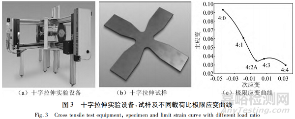 然而,實驗加載路徑的變化對材料成形極限有著重要的影響,在沖壓成形過程中,材料的應(yīng)變路徑往往為非線性,由標準薄板成形實驗獲得的線性路徑下的成形極限圖不能準確預(yù)測復(fù)雜成形中的材料破裂。為獲得更符合實際成形過程的成形極限圖,Shiratori和Ikegami等人提出了采用十字形試件進行雙向拉伸的實驗方法。通過改變試件兩個方向的載荷比,獲得不同應(yīng)變路徑下的成形極限,實驗裝置、試樣形狀及極限應(yīng)變曲線如圖3所示。該實驗方法優(yōu)點在于,板料一直保持平面狀態(tài)受力,方便進行理論分析,而且可以通過改變兩個方向的載荷比使中心區(qū)域?qū)崿F(xiàn)不同的應(yīng)力應(yīng)變狀態(tài),近幾年十字形試件雙向拉伸實驗法開始成為研究不同加載路徑下成形極限圖的熱點。