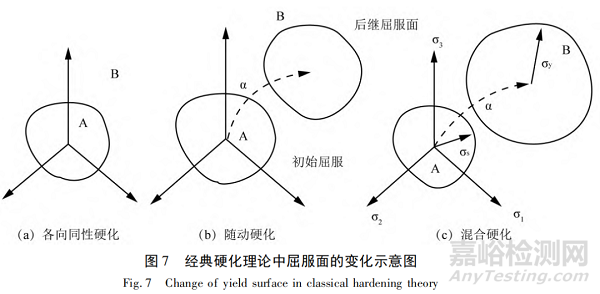 描述金屬薄板塑性變形過程中硬化行為的模型主要分為各向同性硬化模型、隨動硬化模型和混合硬化模型。各向同性硬化認為后繼屈服面相對初始屈服面只發(fā)生尺寸的變化而位置不變;隨動硬化模型認為后繼屈服面只發(fā)生位置的移動,而屈服面的尺寸不發(fā)生變化;混合硬化模型認為真實硬化行為體現(xiàn)的是各向同性硬化與隨動硬化的混合,即塑性變形中多數(shù)材料的屈服面既有尺寸的變化,也有位置的變化。