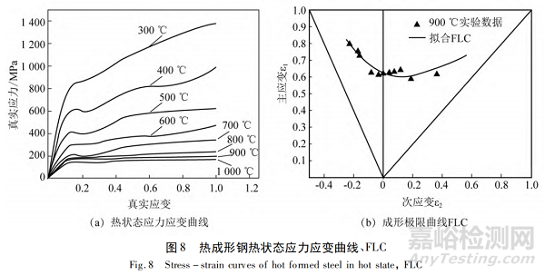 熱成形性能評價指標與冷成形類似,包括熱狀態(tài)應(yīng)力應(yīng)變曲線、n值、r值、成形極限曲線FLC等,這些指標需要通過熱拉伸試驗機、熱沖壓綜合試驗機測定,典型熱成形鋼熱狀態(tài)應(yīng)力應(yīng)變曲線、成形極限FLC如圖8所示。