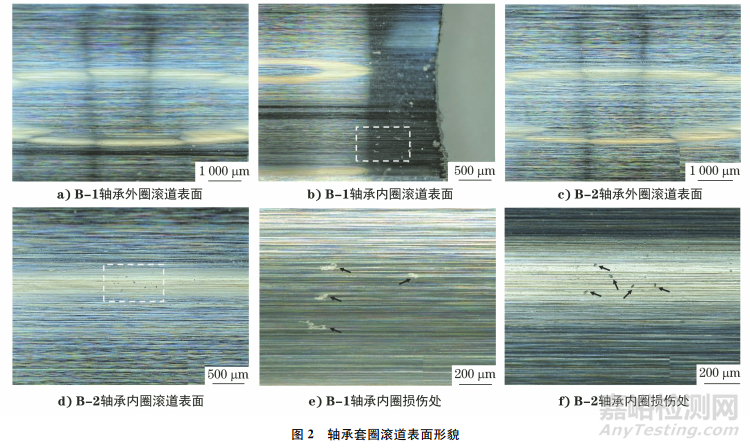 在體視顯微鏡下觀察B-1、B-2軸承的外圈和內(nèi)圈滾道表面,結(jié)果如圖2所示。由圖2可知:失效軸承的外圈滾道表面損傷程度輕微,內(nèi)圈滾道表面則可見明顯的剝落坑。對軸承內(nèi)圈滾道表面的典型損傷區(qū)域進行放大觀察,可見B-1軸承內(nèi)圈滾道表面的損傷面積較大,而B-2軸承內(nèi)圈滾道表面的損傷面積相對較小。
