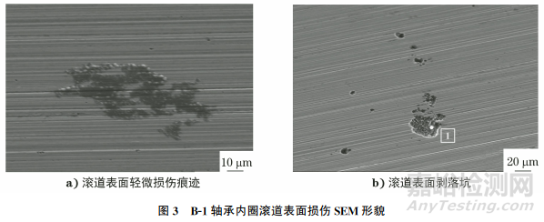 損傷主要集中在軸承內(nèi)圈滾道表面,B-1軸承的損傷面積較大,但大部分為淺表層損傷,局部存在聚集型剝落,剝落坑形狀規(guī)則,近似為圓形,大面積剝落坑邊緣存在較多點蝕坑,為接觸疲勞早期失效