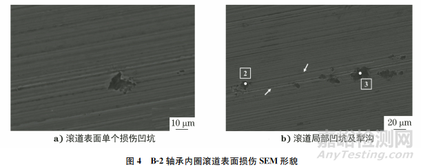 用掃描電鏡對B-2軸承內(nèi)圈滾道表面試樣進行觀察,結(jié)果如圖4所示。由圖4可知:B-2軸承內(nèi)圈滾道表面損傷處呈不規(guī)則形狀,損傷較深,邊緣處為尖角局部存在若干沿直線排列的不規(guī)則損傷凹坑,凹坑邊緣存在塑性變形痕跡,且凹坑之間有兩條較深的犁溝。
