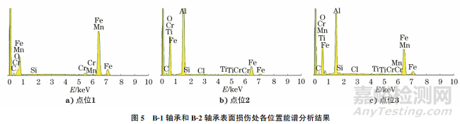 選取B-1軸承表面剝落坑處和B-2軸承表面損傷處進行能譜分析,結(jié)果如圖5所示。由圖5可知:B-1軸承表面剝落坑內(nèi)O元素含量較高,但B-2軸承表面損傷處的O元素含量明顯高于B-1軸承表面,且凹坑內(nèi)含有較多的Al元素和少量 Ti元素,Al元素和Ti元素為外來元素。