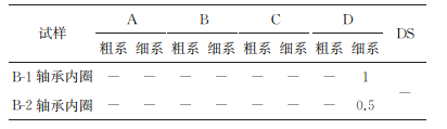 在B-1、B-2軸承內(nèi)圈切取金相試樣,將截面拋光后,按照 GB/T 10561—2005《鋼中非金屬夾雜物含量的測定 標準評級圖顯微檢驗法》進行夾雜物評級,結(jié)果如表1所示,結(jié)果顯示B-1、B-2軸承的夾雜物含量較低。