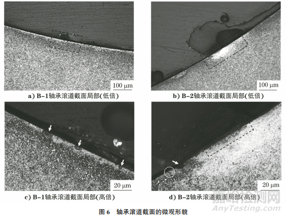 的典型損傷形貌。截面的金相檢驗結(jié)果表明,滾道表面存在均勻分布的極薄二次淬火層,表明B-1軸承表面磨損程度較輕,無明顯異常損傷。滾道表面存在若干較淺的小面積剝落坑。B-2軸承的損傷面積相對較小,但損傷較深,損傷凹坑分布比較集中。在凹坑邊緣存在明顯塑性變形,個別凹坑之間可見較深的犁溝,能譜測試發(fā)現(xiàn)損傷凹坑內(nèi) O、Al元素的含量較高,Ti元素含量較低。B-2軸承的損傷為硬鋁碎屑進入軸承導致,鋁屑進入接觸表面發(fā)生磨粒磨損,在表面形成擠壓凹坑,隨著軸承的轉(zhuǎn)動,在滾道表面形成較深的犁溝。B-2軸承的滾道表面存在接觸疲勞短裂紋,局部表面存在較深的半月形二次淬火層,結(jié)合能譜分析結(jié)果可知,B-2軸承滾道表面的氧化程度明顯高于B-1軸承。二次淬火組織主要為細小的馬氏體,其硬度高、脆性大,在外力作用下極易發(fā)生開裂剝落,在B-2軸承的二次淬火層內(nèi)部也觀察到較大面積的剝落損傷。在循環(huán)載荷的作用下,表面硬度與金屬表面塑性變形程度相關(guān),B-1軸承的內(nèi)圈滾道硬度較低,且硬度分布不均勻,促進了其淺表層損傷。