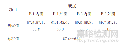 在B-1、B-2軸承套圈滾道表面隨機選取3個位置進行硬度測試,測試結(jié)果如表2所示,根據(jù)JB/T 1255—2014《滾動軸承 高碳鉻軸承鋼零件熱處理技術(shù)條件》,可知硬度均符合標準要求。B-1軸承套圈的硬度略低于B-2軸承;標準要求同一軸承套圈的硬度差應小于2HRC,其中B-1軸承的內(nèi)圈硬度差超出標準值。