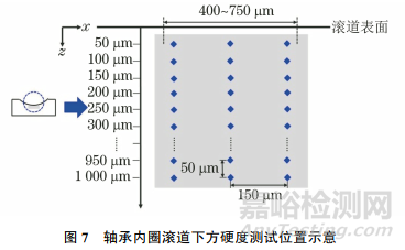 使用自動顯微硬度計對軸承內(nèi)圈滾道下方50~1000μm深度位置進行硬度梯度測試,每個測試深度取3個相鄰點位進行測試,并對結(jié)果取平均值。軸承內(nèi)圈滾道下方硬度測試位置如圖7所示。