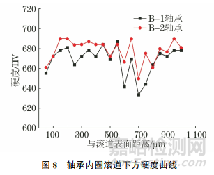 軸承內(nèi)圈滾道下方硬度曲線如圖8所示,結(jié)果顯示B-1軸承的硬度略低于B-2軸承,且其不同點位的硬度波動較大,說明B-1內(nèi)圈硬度分布不均勻。