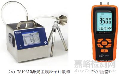 本次實(shí)驗(yàn)選用TSI9310激光塵埃粒子計(jì)數(shù)器,此計(jì)數(shù)器可測粒徑范圍為:0.5~25μm;用壓差計(jì)檢測,實(shí)驗(yàn)器材見圖3。對(duì)于潔凈區(qū)域,采樣點(diǎn)的布置應(yīng)符合一定的要求(見表2)。