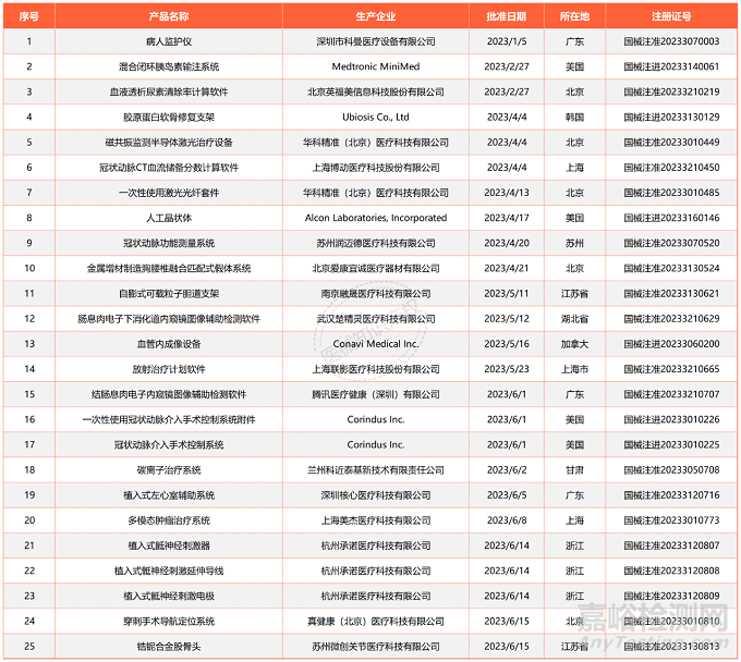 根據(jù)中國(guó)國(guó)家藥監(jiān)局(NMPA)官網(wǎng)公示信息,截止到本文發(fā)布日期,總計(jì)已有25款醫(yī)療器械通過(guò)創(chuàng)新醫(yī)療器械特別審查程序(即“綠色通道”)獲批上市,具體信息如下表所示: