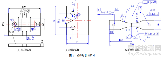 垂直于焊接方向在焊接接頭上取樣,經(jīng)砂紙打磨,機(jī)械拋光后,在光學(xué)顯微鏡下觀察截面形貌。以焊縫為中心,垂直于焊接方向截取尺寸為105mm×20mm×5.5mm的拉伸試樣,取樣位置和試樣形狀如圖1(a)所示。根據(jù) GB/T 228-2002,采用電子萬能試驗機(jī)進(jìn)行室溫拉伸試驗,拉伸速度為1mm·min-1,各測3個試樣。采用掃描電鏡(SEM)觀察接頭拉伸斷口形貌。在焊接接頭母材和接頭區(qū)域截取如圖1(b)所示的撕裂試樣,試樣上開V型缺口,缺口分別位于熱影響區(qū)(距焊縫邊緣0.5mm)、遠(yuǎn)離焊縫區(qū)(距焊縫邊緣3mm)、焊縫中心,其中母材試樣以及缺口在熱影響區(qū)和遠(yuǎn)離焊縫區(qū)試樣的缺口垂直于焊接方向,缺口在焊縫中心試樣的缺口平行于焊接方向。根據(jù)ASTM E1820-2001,采用電子萬能試驗機(jī)進(jìn)行室溫撕裂試驗,撕裂速度為1mm·min-1,加載前對其施加400N預(yù)載荷,以消除夾具和試樣間的間隙。以焊縫為中心,垂直于焊接方向截取尺寸如圖1(c)所示的疲勞試樣,根據(jù)ASTM E466-2015,采用高頻疲勞試驗機(jī)進(jìn)行疲勞試驗,按照成組法進(jìn)行疲勞壽命測試,確定疲勞強(qiáng)度和應(yīng)力-疲勞壽命(S-N)曲線,應(yīng)力循環(huán)比R取0,循環(huán)次數(shù)最高為107次,各測3個試樣。以循環(huán)107周次對應(yīng)的應(yīng)力為疲勞強(qiáng)度。