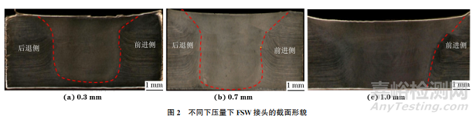圖2中虛線部分為焊縫區(qū)域。由圖2可見,當(dāng)下壓量為0.3mm時,焊縫根部存在明顯的未焊透部位。隨著下壓量的增大,根部未焊透現(xiàn)象得到顯著改善。