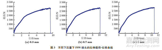 7N01鋁合金母材的抗拉強(qiáng)度為434.65MPa,屈服強(qiáng)度為295.56MPa,斷后伸長率為16%。由圖3計算可知:當(dāng)下壓量為0.3,0.7,1.0mm時,7N01鋁合金攪拌摩擦焊接頭的抗拉強(qiáng)度分別為351.78,324.82,352.70MPa;屈服強(qiáng)度分別為241.72,232.13,243.63MPa。在3種不同下壓量下,接頭的抗拉強(qiáng)度與母材相比變化不大,均可達(dá)到母材的80%左右。