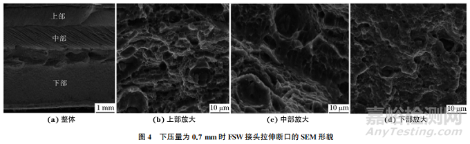 在3種下壓量下,接頭的拉伸斷裂位置均位于焊縫中心,宏觀斷裂形貌相似,選取下壓量為0.7mm時的接頭進(jìn)行拉伸斷口分析。由圖4可見,整體拉伸斷口包括上中下3個部分,上部和下部斷口均較粗糙,中部斷口撕裂條紋比較明顯,這是因為焊縫中心由于攪拌作用存在洋蔥環(huán)的形貌特征,在斷裂過程中裂紋會沿洋蔥環(huán)擴(kuò)展。上部和下部的斷口具有明顯的韌窩特征,這說明在試樣上下表面附近發(fā)生塑性斷裂。中部斷口撕裂條紋上也存在明顯韌窩,在條紋的斜面部分也具有明顯的小尺寸韌窩特征。綜上可知,接頭整體上屬于塑性斷裂。