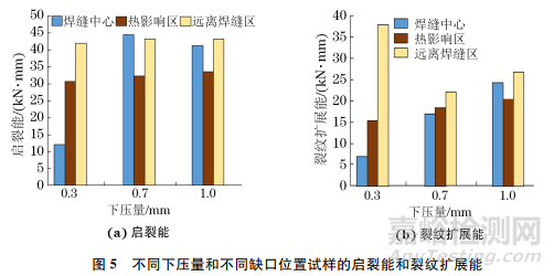 結(jié)合圖5(a)和(b)可知:在相同下壓量和缺口位置的條件下試樣的裂紋擴(kuò)展能均小于啟裂能,說明接頭和母材的抗裂紋擴(kuò)展能力都低于其抗啟裂能力。綜合考慮不同下壓量和不同缺口位置接頭的啟裂能和裂紋擴(kuò)展能,當(dāng)下壓量為0.7,1.0mm 時,接頭的啟裂能和裂紋擴(kuò)展能相近。