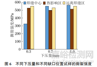 母材的撕裂強(qiáng)度為(580±10)MPa。由圖6可見:在下壓量為1.0mm和0.7mm 時,缺口在焊縫中心試樣的撕裂強(qiáng)度均與母材相近,說明焊縫區(qū)域具有較好的縱向抗撕裂性能,但下壓量為0.3mm時焊縫的縱向撕裂強(qiáng)度明顯低于母材;3種下壓量下缺口在熱影響區(qū)試樣的撕裂強(qiáng)度均低于母材,說明接頭的熱影響區(qū)抗撕裂性能較差,是薄弱部位;在3種下壓量下缺口在遠(yuǎn)離焊縫區(qū)試樣的撕裂強(qiáng)度均低于母材但高于缺口在熱影響區(qū)試樣,說明遠(yuǎn)離焊縫區(qū)(距焊縫邊緣3mm)具有優(yōu)良的抗撕裂性能。綜上可知,當(dāng)下壓量為0.7,1.0mm 時接頭具有較高的撕裂強(qiáng)度。