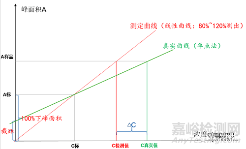 有人對于截距的要求不是很理解,認(rèn)為只要測量線性的幾個(gè)點(diǎn)之間相關(guān)系數(shù)達(dá)到要求及成線性了,那在這范圍內(nèi)的檢測都應(yīng)該是準(zhǔn)確的,為什么要求截距呢?首先對于主物質(zhì)的含量,一般是做80%~120%之間的線性,要求截距不大于2%,這是因?yàn)楹康幕厥章蕵?biāo)準(zhǔn)一般是98%~102%,我們一般檢測的時(shí)候都用的是單點(diǎn)法,也就是默認(rèn)線性過原點(diǎn),截距是0,峰面積與濃度成正比,例如標(biāo)準(zhǔn)品濃度是1mg/ml,峰面積是1000,那峰面積是1000的時(shí)候可以得出樣品的真實(shí)濃度是1.0mg/ml(如圖1的測定曲線),但如果真實(shí)的線性曲線截距不等于0而是100,標(biāo)準(zhǔn)品濃度是1mg/ml,峰面積是1100,那樣品峰面積1100的時(shí)候,如果用外標(biāo)法即單點(diǎn)法計(jì)算的時(shí)候濃度激素1.1mg/ml了(如圖1的真實(shí)曲線),但實(shí)際上樣品的濃度是1.0mg/ml(即用標(biāo)準(zhǔn)曲線法計(jì)算所得),誤差也就在1%左右,相對應(yīng)的截距占標(biāo)準(zhǔn)峰面積的1%,因此也就得出截距在2%之內(nèi),那誤差也就在±2%之間,在含量標(biāo)準(zhǔn)要求范圍內(nèi),回收率也是合格的,如果截距超過2%,則誤差就超過范圍了,那在檢測樣品的時(shí)候可能就會(huì)出現(xiàn)含量不合格、回收率達(dá)不到要求的現(xiàn)象,而實(shí)際上含量是合格的。如果截距不符合要求,不說明方法不能定量,只是不能采用常用的一個(gè)對照濃度進(jìn)行測定,需要采用多個(gè)濃度的標(biāo)準(zhǔn)曲線法進(jìn)行。同理對于有關(guān)物質(zhì)和殘留溶劑,也是同樣的道理。