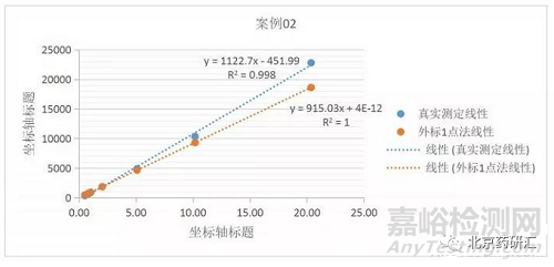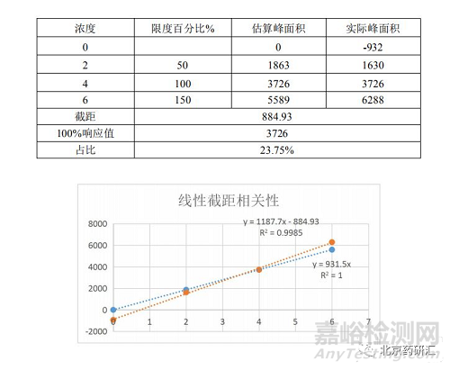 化藥雜質(zhì)控制一般采用外標(biāo)一點(diǎn)法進(jìn)行,即默認(rèn)線性通過原點(diǎn),需評估線性偏離對測定結(jié)果的影響,Y軸截距的絕對值應(yīng)在標(biāo)準(zhǔn)響應(yīng)值的25%以內(nèi)。