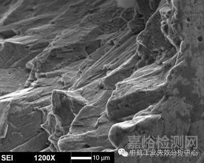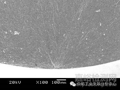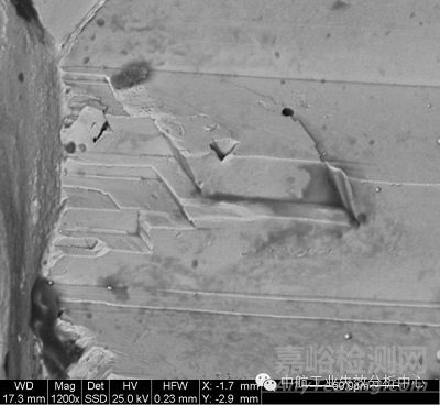 有的起源也不僅僅在一處位置起源,可能在多個位置均萌生疲勞源,這時我們就可以看到多個疲勞源之間產(chǎn)生類似臺階的特征,這是由于多處萌生裂紋并擴展過程中,不可能在一個平面上擴展,當(dāng)裂紋相互交匯到一起時,必然通過剪切撕裂的方式使不同的擴展平面連接起來,從而形成臺階。