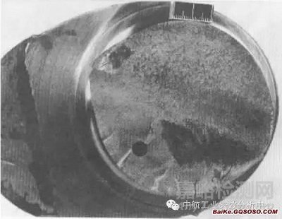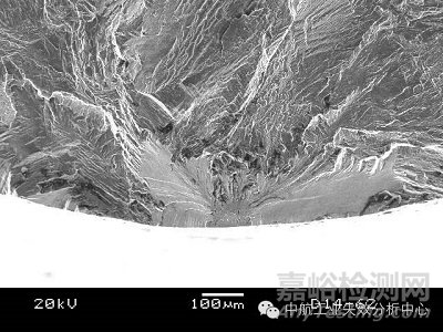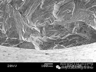 這類的源區(qū)附近斷面由于交錯分布多個解理面,因此比較粗糙,之后的疲勞擴展前、中期則會轉(zhuǎn)為平坦,最后失穩(wěn)后的快速擴展又重新變得起伏大和粗糙。此外,有些疲勞并不一定從試樣表面起源,有可能在試樣內(nèi)部,此時往往可能由于內(nèi)部存在缺陷或亞表面處于特殊應(yīng)力狀態(tài)導(dǎo)致。