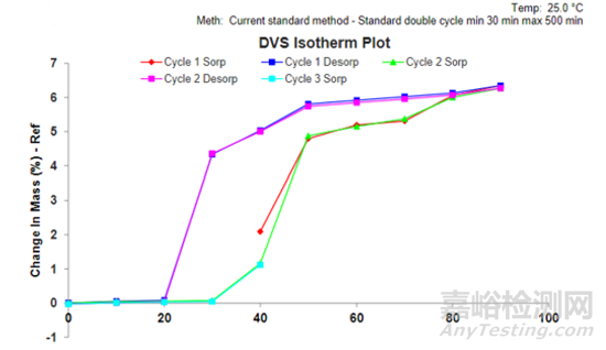 該實驗從40%RH始實驗-紅色的線,連續(xù)兩個循環(huán),先從40%RH到90%RH(Cycle 1 sorp),然后從90%RH回到0%RH(Cycle 1 Desorp),再從0%RH到90%RH(Cycle 2 sorp),90%RH回到0%RH(Cycle 2 Desorp),最后0%RH回到40%RH(Cycle 3 sorp)。