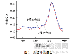 由圖1可見,兩個比色皿裝樣獲得的近紅外光譜整體趨勢相似,但1號比色皿對應(yīng)的吸光度較強,特征峰更明顯。