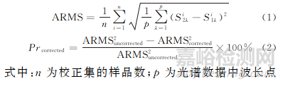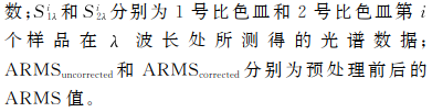 采用光譜平均差異(ARMS)來評價光譜差異大小,采用光譜校正率(Prcorrected)來評價光譜校正效果。ARMS和Prcorrected的計算公式見公式(1)和公式(2)。