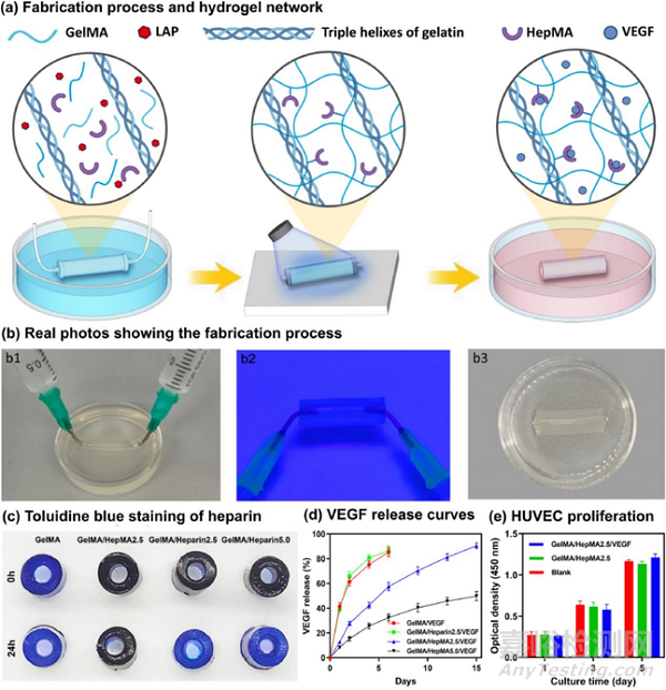 圖2:GelMA/HepMA/VEGF水凝膠支架的制備和表征:(a)GelMA/HepMA/VEGF水凝膠支架的制備流程及水凝膠網(wǎng)絡(luò)結(jié)構(gòu)示意圖;(b)制造過程中的實(shí)物照片;(c)水凝膠支架中肝素的甲苯胺藍(lán)染色;(d)水凝膠支架中的VEGF釋放行為;(e)內(nèi)皮細(xì)胞在水凝膠表面的增殖。