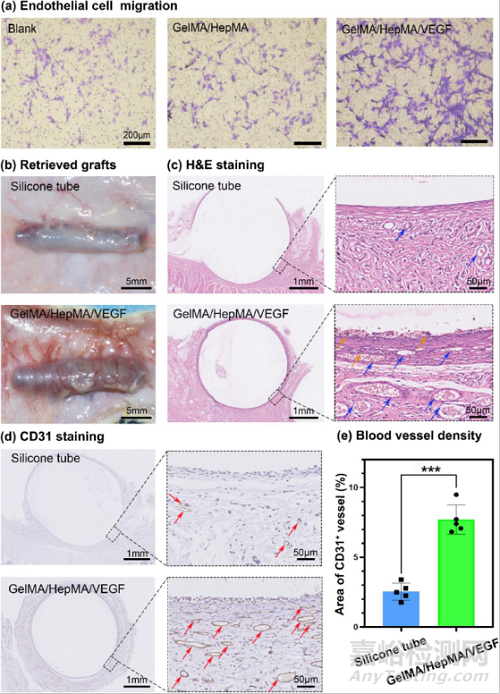 圖3:GelMA/HepMA/VEGF水凝膠支架的體外和體內(nèi)血管生成:(a)通過體外transwell遷移試驗(yàn)評(píng)估水凝膠支架對(duì)內(nèi)皮細(xì)胞的募集能力;(b)皮下植入15天后的硅膠管和水凝膠支架的照片;(c)回收的硅膠管和水凝膠支架的H&E染色;(d)回收的硅膠管和水凝膠支架的CD31免疫組織化染色;(e)硅膠管和水凝膠支架皮下植入15天后誘導(dǎo)的血管密度。