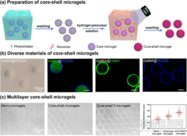 接著,利用微流控技術(shù)制備了單核的微凝膠,并通過浸泡法負(fù)載光引發(fā)劑。而后將微凝膠轉(zhuǎn)移到含有雙鍵的水凝膠前體溶液中,引發(fā)劑從單核微凝膠向外擴(kuò)散,光引發(fā)使水凝膠前體溶液在微凝膠表面聚合,實(shí)現(xiàn)功能性殼層的構(gòu)建,最終得到了核殼結(jié)構(gòu)的微凝膠(圖4)。通過更換不同的核殼材料,以及構(gòu)建不同殼層數(shù)量的核殼微凝膠,驗(yàn)證了該方法用于制備核殼微凝膠的可行性和普適性。