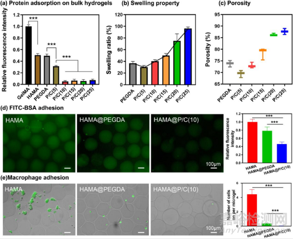 圖5:核殼微凝膠的抗蛋白和細(xì)胞粘附性能:(a)熒光蛋白在不同塊狀水凝膠表面的吸附;(b)不同塊狀水凝膠的溶脹性能;(c)不同塊狀水凝膠的孔隙率;(d)熒光蛋白在微凝膠表面的粘附;(e)巨噬細(xì)胞在微凝膠表面的粘附。