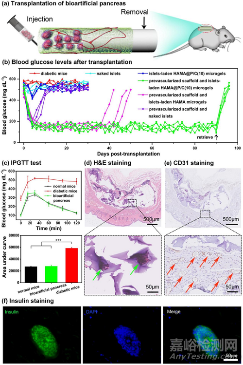 圖7:將生物人工胰腺移植到STZ誘導(dǎo)的糖尿病小鼠皮下動(dòng)物實(shí)驗(yàn):(a)胰島移植過程示意圖;(b)移植后的小鼠血糖水平;(c)腹腔葡萄糖耐量試驗(yàn)(IPGTT);(d)移植90天后取回的生物人工胰腺的H&E染色,(e)CD31免疫組織化學(xué)染色和(f)胰島素免疫熒光染色。