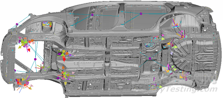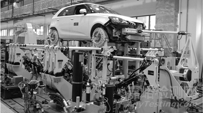 為了盡早發(fā)現(xiàn)問題并進(jìn)行快速整改驗(yàn)證、減少道路試驗(yàn)失效風(fēng)險和試驗(yàn)輪次,通常會在道路疲勞試驗(yàn)之前采用24通道整車道路振動模擬試驗(yàn)系統(tǒng)進(jìn)行臺架疲勞試驗(yàn)[3]。24通道在垂向、縱向及側(cè)向上都可以很好地復(fù)現(xiàn)路面對整車的激勵,可以對車身結(jié)構(gòu)件進(jìn)行疲勞耐久性能考核。相對于試車場道路疲勞試驗(yàn),臺架疲勞試驗(yàn)在室內(nèi)進(jìn)行,不易受外界因素影響,數(shù)據(jù)一致性及結(jié)果重復(fù)性好,能夠較好地完善驗(yàn)證CAE分析[4],而且能在較短的時間內(nèi)完成試驗(yàn),可為項(xiàng)目節(jié)省成本和時間,有效提高項(xiàng)目開發(fā)效率。