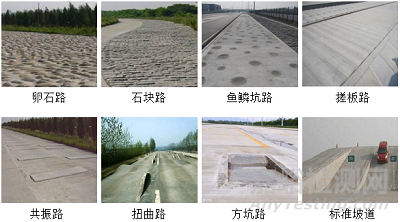 由于影響疲勞耐久性能的因素很多,僅依靠CAE仿真分析及臺架疲勞試驗(yàn)難以把所有的因素都考慮在內(nèi),所以最終都要通過實(shí)際的道路試驗(yàn)來確保疲勞耐久性能滿足使用要求。試驗(yàn)樣車在試車場內(nèi)特定的試驗(yàn)道路上,按照特定的試驗(yàn)規(guī)范駕駛來重現(xiàn)汽車在整個設(shè)計生命周期內(nèi)的疲勞損傷。試車場用于疲勞耐久試驗(yàn)的主要道路有:比利時石塊路、卵石路、魚鱗坑路、搓板路、起伏路、搖擺路、破損路、方坑、標(biāo)準(zhǔn)坡道等,通過這些道路能夠模擬客戶實(shí)際使用中的典型路面工況,進(jìn)而達(dá)到考核產(chǎn)品疲勞耐久性能的目的。試驗(yàn)規(guī)范的制定是通過采集客戶的實(shí)際使用數(shù)據(jù),然后結(jié)合試車場特定耐久性道路,通過調(diào)整在不同路面上的車速和循環(huán)次數(shù),達(dá)到等效客戶實(shí)際使用時的疲勞損傷。為了縮短試驗(yàn)周期,試車場疲勞耐久試驗(yàn)一般按照4~10倍的系數(shù)強(qiáng)化[5],下圖為道路疲勞試驗(yàn)的部分典型路面。