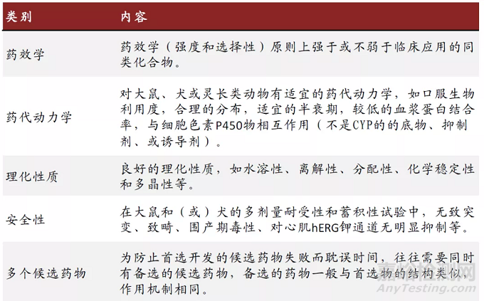 候選藥物的確定標(biāo)志著分子設(shè)計、化學(xué)合成、生物評價循環(huán)反饋的完成,達到了新藥開發(fā)的標(biāo)準(zhǔn)。候選藥物的確定也沒有統(tǒng)一的標(biāo)準(zhǔn),每個項目選擇的候選藥物數(shù)量也不盡相同,總的趨勢是要求候選藥物具有較好的成藥性,為了降低研發(fā)失敗的概率、縮短開發(fā)時間,候選藥物的選定一般要遵循以下原則。