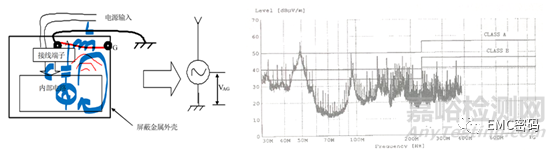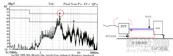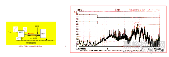 下圖是進行傳導騷擾測試時,EUT的接地線、電源線、參考接地板、LISN組成回路的諧振點與EUT中騷擾源頻率的諧波同頻,諧振時,騷擾源會在EUT的接地線、電源線、參考接地板、LISN組成回路中感應出最大的共模電流,從而導致該諧振頻點上傳導騷擾值最高。
