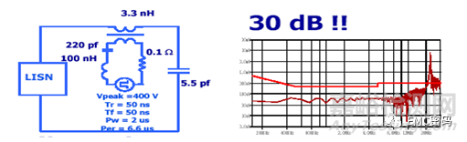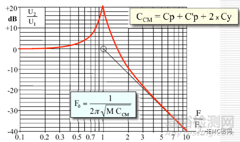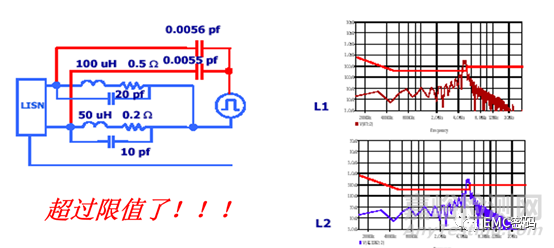下圖也是開關電源中,開關回路主回路中的分布電容和分布電感發(fā)生諧振,當開關信號的諧波頻率與諧振頻率同頻時,主回路中的電流達到最大,從而引起向外部共?;芈返母行择詈?,最終使共模傳導騷擾超標。