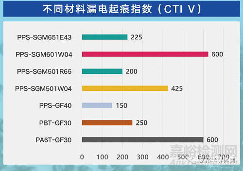 將50滴0.1%濃度的氯化銨溶液滴在3 mm材料上并測(cè)量施加在材料兩端的最大電壓差作為材料的性能參數(shù)。耐漏電起痕指數(shù)(PTI)是指對(duì)五個(gè)測(cè)試樣品做上述測(cè)試,所有樣品均通過測(cè)試不產(chǎn)生漏電起痕的最大電壓。