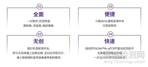 全球首個(gè)獲得美國(guó)FDA突破性醫(yī)療器械認(rèn)定的自主研發(fā)的基于全癌標(biāo)志物的尿路上皮癌(膀胱癌、輸尿管癌和腎盂癌)尿液同步檢測(cè)產(chǎn)品。