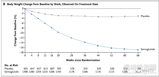 目前治療肥胖最火的技術(shù)無疑以司美格魯肽為代表的減肥神藥。NEJM 發(fā)表司美格魯肽和安慰劑雙盲對照 III 期臨床研究結(jié)果顯示,司美格魯肽用藥 68 周后,體重變化的均值為 -14.9%,中位減輕重量為 15.3 kg,這個減肥效果還是非常明顯的。