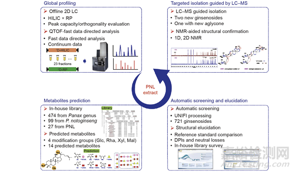 圖2. 利用離線2D LC-高分辨質譜(HRMS)聯(lián)用技術和基于UNIFI軟件預測代謝產(chǎn)物數(shù)據(jù)匹配對三七(P. notoginseng)葉(PNL)進行全局分析的典型流程圖。首先,利用正交的HILIC×RPLC-四極桿飛行時間(QTOF)MS系統(tǒng)表征三七葉中的人參皂苷。其次,分別構建人參、三七和三七葉的人參皂苷庫,在三七庫中的每個成分均產(chǎn)生14種預測代謝產(chǎn)物。接著,通過UNIFI中的預測代謝產(chǎn)物篩查(PMS)和預測庫自動篩查出人參皂苷,并通過對照物質人參皂苷的裂解行為研究進行解釋。最后,通過LC-MS導向分離對兩種化合物進行提純,并通過核磁共振(NMR)波譜法明確鑒定這兩種化合物的結構,用于驗證該方法在新化合物發(fā)現(xiàn)中的可靠性。Glc:葡萄糖;Rha:鼠李糖;Xyl:木糖;Mal:丙二酰。