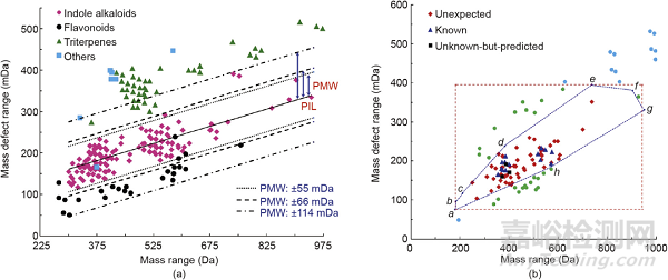 逐步母離子列表(PIL)光柵MDF觸發(fā)DDA模式旨在篩查鉤藤(Uncariae Ramulus cum Uncis)5種植物來源的吲哚類生物堿[圖3(a)]。通過線方程和LTQ-Orbitrap中的最佳母離子質量寬度(PMW)參數(shù)創(chuàng)建理論吲哚類生物堿的逐步PIL。根據(jù)實驗室建立的鉤藤生物堿庫,以整數(shù)質量為x軸、以質量虧損為y軸建立方程。PMW經(jīng)過優(yōu)化,可以覆蓋潛在的吲哚類生物堿并盡可能排除其他成分。與傳統(tǒng)的MDF法相比,這種方法非常方便,可以鑒定更多潛在的新吲哚類生物堿。