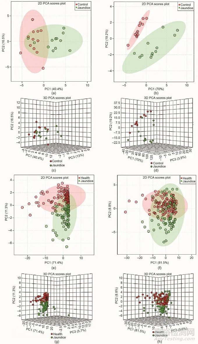 圖2. 小鼠和臨床受試者非靶標(biāo)血液代謝組學(xué)的多變量分析輪廓圖。負(fù)離子模式(a、c)和正離子模式(b、d)下小鼠二維和三維PCA得分圖;負(fù)離子模式(e、g)和正離子模式(f、h)下臨床受試者二維和三維PCA得分圖。PC:主成分。