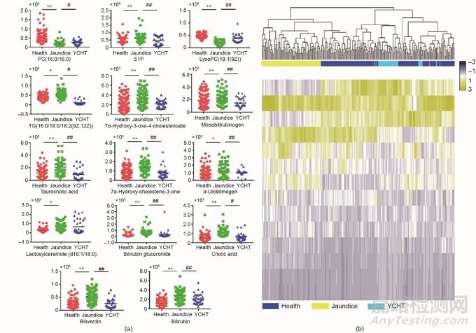 圖3. 臨床受試者數(shù)據(jù)集2各組血液代謝物含量的變化圖。(a)健康受試者、黃疸患者和茵陳蒿湯治療患者三組之間生物標(biāo)志物相對(duì)強(qiáng)度散點(diǎn)圖;(b)健康受試者、黃疸患者和茵陳蒿湯治療患者三組之間生物標(biāo)志物相對(duì)強(qiáng)度熱圖。結(jié)果用 ± SD表示。*P < 0.05和**P < 0.01與健康受試者相比;#P < 0.05和##P < 0.01與黃疸患者相比。S1P:鞘氨醇-1-磷酸酯;PC:磷脂酰膽堿;TG:甘油三酯。