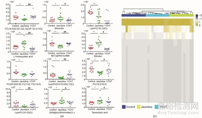 圖4. 小鼠數(shù)據(jù)集2各組血液代謝物含量的變化圖。(a)對(duì)照組、模型組和茵陳蒿湯組三組之間生物標(biāo)志物相對(duì)強(qiáng)度散點(diǎn)圖;(b)對(duì)照組、模型組和茵陳蒿湯組三組之間生物標(biāo)志物相對(duì)強(qiáng)度熱圖。結(jié)果用 ± SD表示。*P < 0.05和**P<0.01與對(duì)照相比;#P < 0.05和##P < 0.01與模型組相比。