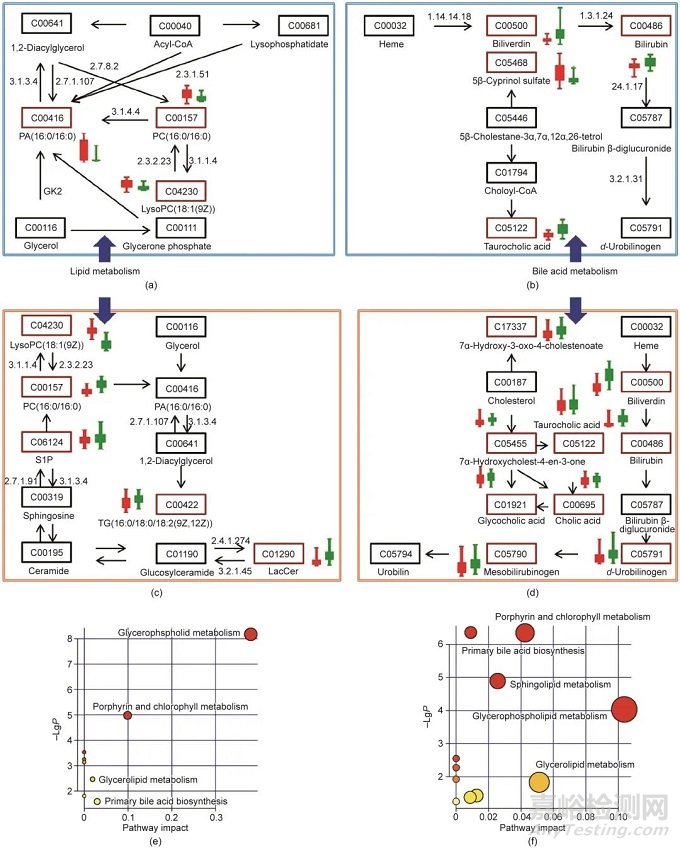 圖5 臨床黃疸患者和黃疸模型小鼠相關(guān)代謝通路網(wǎng)絡(luò)圖。藍(lán)色框內(nèi)代表的是黃疸小鼠主要代謝通路,包括脂質(zhì)代謝(a)和膽汁酸代謝(b)。橙色框內(nèi)代表黃疸患者主要代謝通路,包括脂質(zhì)代謝(c)和膽汁酸代謝(d)。利用MetaboAnalyst 3.0軟件Pathway Analysis分析了存在于黃疸小鼠(e)和臨床黃疸患者(f)體內(nèi)的代謝通路概況。方框內(nèi)ID號(hào)代表本項(xiàng)研究中檢測(cè)到的代謝標(biāo)志物的KEGG號(hào),其中,紅框中的ID號(hào)代表差異表達(dá)的代謝物,其他框內(nèi)的ID號(hào)代表在本項(xiàng)研究中未被檢測(cè)到的代謝物。箭頭上的符號(hào)代表KEGG提供的關(guān)鍵酶;紅色方框旁邊的箱型圖呈現(xiàn)了對(duì)照組(紅色)和黃疸組(綠色)之間的相對(duì)差異強(qiáng)度。LacCer:乳糖酶基(神經(jīng))鞘氨醇;CoA:輔酶A。