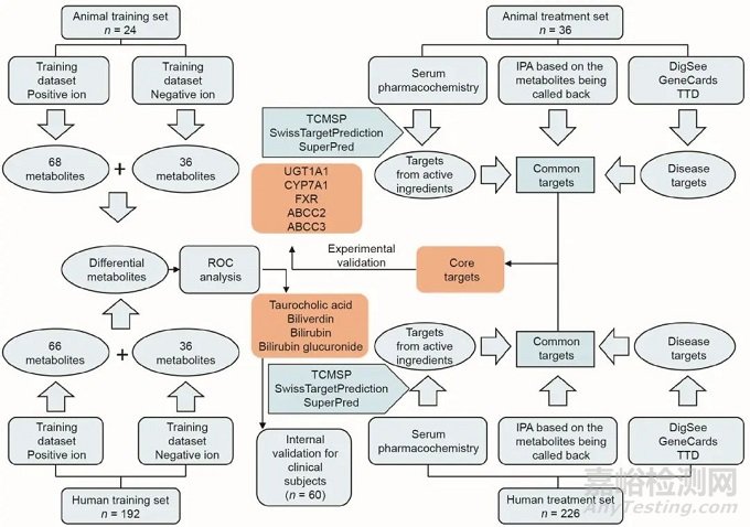 本研究開(kāi)發(fā)了基于中藥血清藥物化學(xué)、代謝組學(xué)技術(shù)、網(wǎng)絡(luò)藥理學(xué)方法和實(shí)驗(yàn)驗(yàn)證于一體的破譯中藥方劑活性成分和核心靶標(biāo)的新策略,研究設(shè)計(jì)的思路如圖1所示。首先招募了226名受試者和60只小鼠,從臨床和動(dòng)物兩個(gè)方面通過(guò)非靶標(biāo)代謝組學(xué)技術(shù)揭示疾病生物標(biāo)志物并評(píng)價(jià)方劑療效。其次通過(guò)中藥血清藥物化學(xué)方法發(fā)現(xiàn)茵陳蒿湯的體內(nèi)活性成分,并借助包括數(shù)據(jù)庫(kù)挖掘、MetaboAnalyst 3.0軟件Pathway Analysis模塊(MetPA)和獨(dú)創(chuàng)通路分析軟件(IPA)組學(xué)平臺(tái)的綜合網(wǎng)絡(luò)分析方法確定了潛在作用靶點(diǎn)。鑒于小鼠和人類生物過(guò)程之間的高度相似性,進(jìn)一步整合臨床和動(dòng)物數(shù)據(jù)揭示茵陳蒿湯的活性化合物、作用靶標(biāo)和疾病核心生物標(biāo)志物。最后,對(duì)關(guān)鍵靶標(biāo)進(jìn)行實(shí)驗(yàn)驗(yàn)證,證明該研究策略的可行性。這種方法有助于挖掘中藥生物活性化合物,并發(fā)現(xiàn)其治療疾病的新靶點(diǎn)。